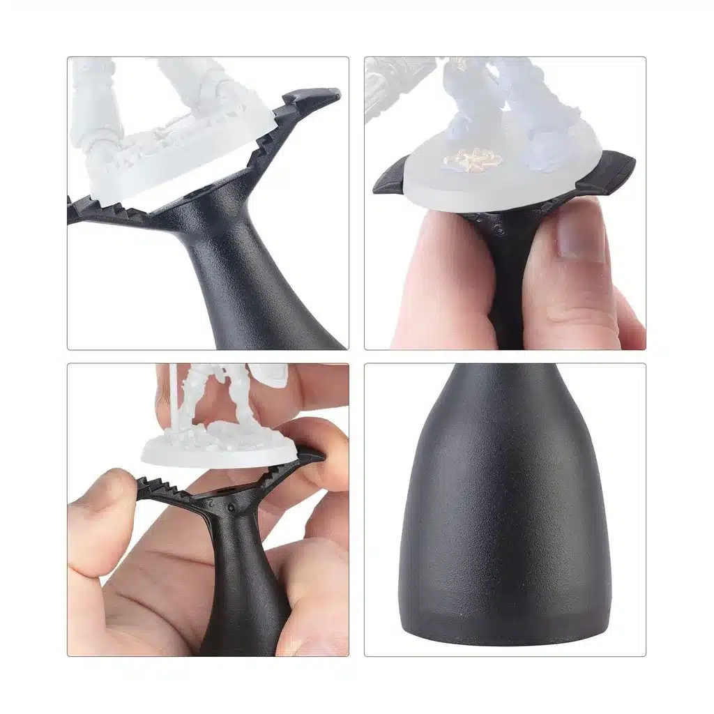 La poignée de peinture est ergonomique et équilibrée, ce qui vous permettra de réduire l’effort de la main, tout en vous évitant de devoir tenir la figurine elle-même avec vos doigts. À son sommet, le mors de forme simple et élancée permet de maintenir fermement vos figurines, sans occuper trop d’espace, ce qui permettra à votre pinceau d’en atteindre facilement les moindres recoins sans que vos doigts vous gênent. Il comporte aussi un logement pour insérer le Support de Sous-assemblage, disponible séparément, ce qui facilitera la peinture des têtes et autres petits éléments.