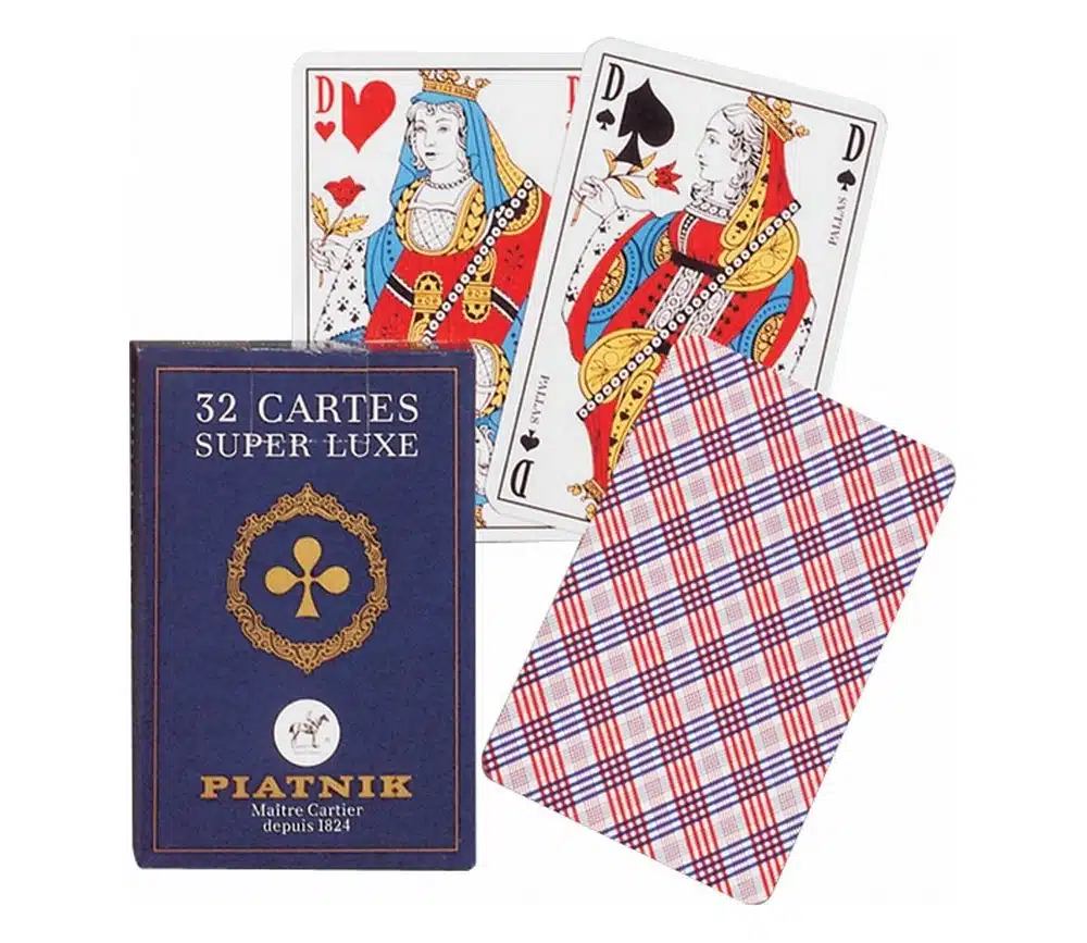 Jeu de 32 cartes à jouer Piatnik avec un dos écossais. Cartes à jouer super Luxe. Jeu avec format et portrait français. Jeu de cartes pour Belote. Cartes qui glissent bien appelées. Taille des cartes : 89 x 58 mm. Index français aux 4 coins. Dos écossais rouge et bleu. Maitre Cartier depuis 1824. Toutes les cartes ont le même dos. La couleur des étuis peut varier rouge ou bleu mais à l’intérieur, uniquement des cartes à dos écossais rouge et bleu.