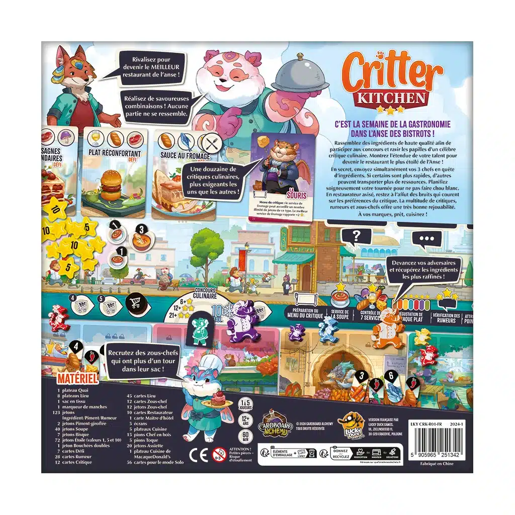 Critter Kitchen est un jeu dans lequel les joueurs décident secrètement où envoyer leurs 3 différents Chefs (travailleurs) dans le but de rassembler les meilleurs ingrédients plus rapidement que leurs concurrents. Des rumeurs circulent sur l’arrivée du Critique en ville, et vos Chefs ont la possibilité de les écouter. Jouez avec des capacités différentes pour le Critique, les Rumeurs et le Restaurateur afin de garantir une expérience différente à chaque partie !