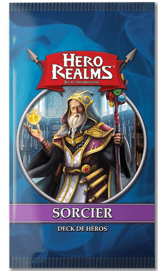 Deck de Héros : Sorcier pour le jeu Hero Realms. Les Decks de Héros remplacent le paquet de départ du joueur afin de jouer un type de personnage particulier.