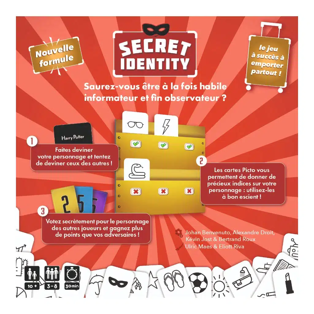Dans Secret Identity, vous vous verrez attribuer une clé Mystère désignant une carte Personnage parmi les 8 disposées au centre de la table, à vous de faire devinez votre personnage avec des pictogrammes.