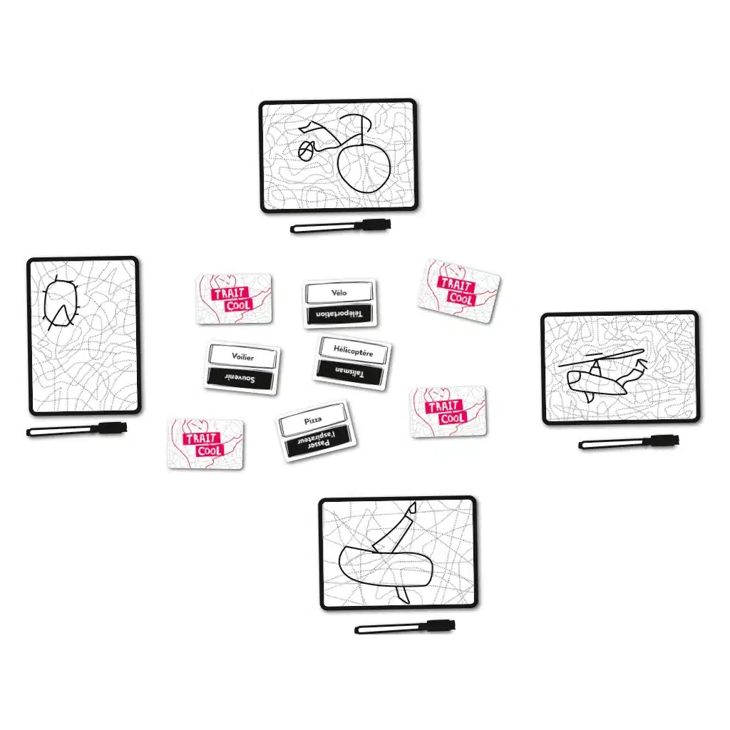 Trait Cool propose une expérience créative et coopérative unique : chaque joueur tente de faire deviner un mot en ne dessinant qu’à travers un réseau de traits déjà tracés. Chaque joueur pioche secrètement un mot et doit le dessiner sur son ardoise… mais uniquement en suivant les lignes pointillées déjà présentes.