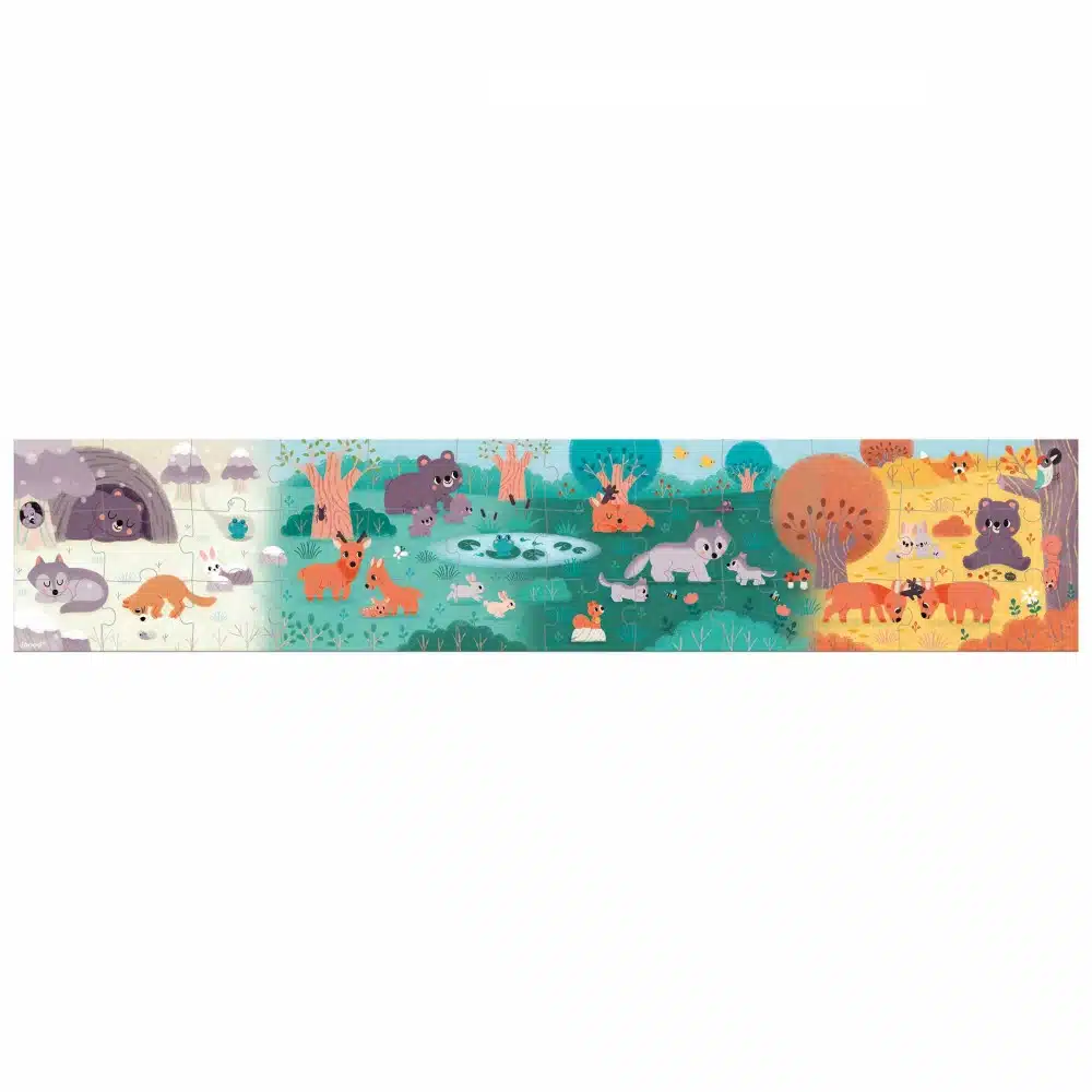 C’est parti pour la découverte de la vie de nos animaux sauvages préférés au fil des saisons ! Laissez les enfants découvrir pas à pas un univers de douceur grâce à ce joli puzzle panoramique de 36 pièces ! Une fois terminé, ce jeu de concentration en carton certifié FSC® mixte (bois issu de forêts gérées durablement) et fabriqué en France avec des encres végétales, mesure 1 mètre de long et permet de se plonger dans la vie de la forêt en hiver, printemps, été et enfin automne ! Un bon moyen pour les enfants dès 4 ans de s’imprégner des particularités de chaque saison tout en assouvissant leur passion pour les puzzles. Ce puzzle permet de développer la concentration, la logique, mais également la dextérité grâce à de grosses pièces adaptées aux petites mains. Un poster permettra d’aider les enfants lors des premières réalisations. Familles loups, ours et lapins attendent les petits pour l’exploration ! Ce jouet est développé en collaboration avec WWF®.